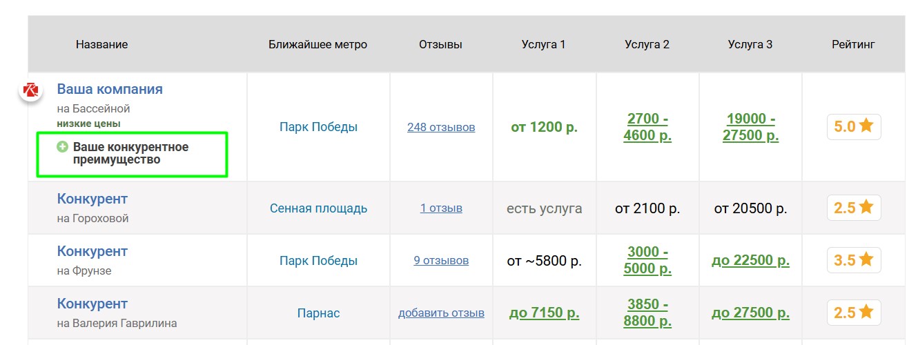 Вокруг продвигаемой таким образом сауны выбирается некоторое количество ближайших конкурирующих саун, продвигаемая сауна попадёт к ним в таблицу «Сравнение по ценам», которая выглядит следующим образом: