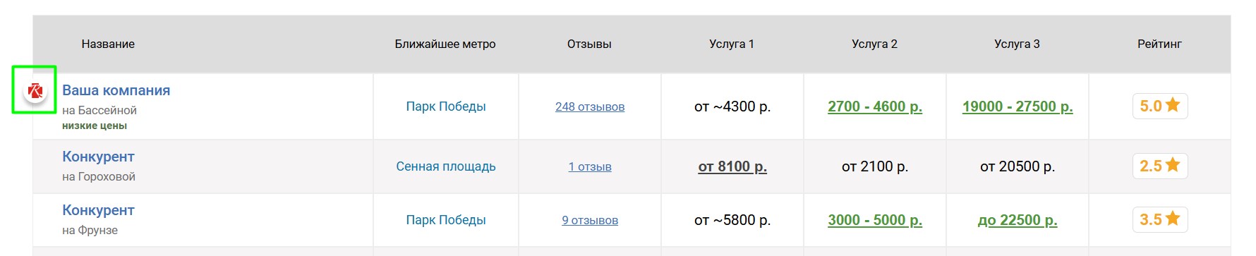 Иконка 16х16 пикселей будет отображаться слева от названия вашей сауны в таблицах, выделяя её среди прочих. Опция увеличивает вероятность перехода на страницу компании и рекомендуется в качестве дополнения к прочим методам продвижения, в первую очередь для саун с узнаваемым брендом.